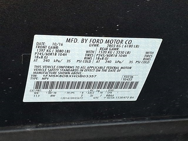 Below is all the standard equipment Equipment Group 200A, 4WD, 18 5-Spoke Painted Aluminum Wheels, 3.65 Axle Ratio, 3rd row seats: split-bench, 4-Wheel Disc Brakes, 6 Speakers, ABS brakes, Air Conditioning, Alloy wheels, AM/FM radio: SiriusXM, Brake assist, Bumpers: body-color, CD player, Compass, Delay-off headlights, Driver door bin, Driver vanity mirror, Dual front impact airbags, Dual front side impact airbags, Electronic Stability Control, Emergency communication system: 911 Assist, Exterior Parking Camera Rear, Four wheel independent suspension, Front anti-roll bar, Front Bucket Seats, Front Center Armrest, Front fog lights, Front License Plate Bracket, Front reading lights, Fully automatic headlights, Heated door mirrors, Illuminated entry, Knee airbag, Leather steering wheel, Low tire pressure warning, Occupant sensing airbag, Outside temperature display, Overhead airbag, Overhead console, Panic alarm, Passenger door bin, Passenger vanity mirror, Power door mirrors, Power driver seat, Power passenger seat, Power steering, Power windows, Radio: AM/FM Stereo w/Single-CD/MP3 Capable, Rear air conditioning, Rear anti-roll bar, Rear Parking Sensors, Rear reading lights, Rear seat center armrest, Rear window defroster, Rear window wiper, Remote keyless entry, Roof rack: rails only, Security system, Speed control, Speed-sensing steering, Speed-Sensitive Wipers, Split folding rear seat, Spoiler, Steering wheel mounted audio controls, SYNC Communication & Entertainment System, Tachometer, Telescoping steering wheel, Tilt steering wheel, Traction control, Trip computer, Turn signal indicator mirrors, and Variably intermittent wipers. Awards:
