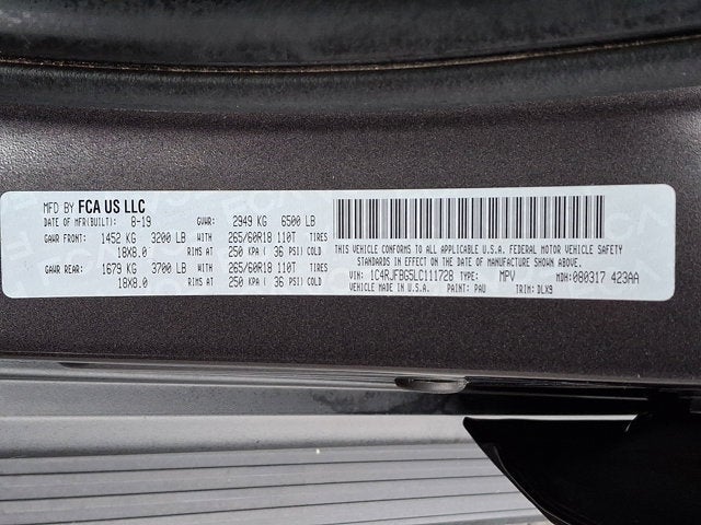 2020 Jeep Grand Cherokee Limited 4WD, 1-Year SiriusXM Guardian Trial, 3.45 Rear Axle Ratio, 4-Wheel Disc Brakes, 4G LTE Wi-Fi Hot Spot, 506 Watt Amplifier, 6 Speakers, 8.4" Touchscreen Display, ABS brakes, Active Noise Control System, Air Conditioning, AM/FM radio: SiriusXM, Anti-whiplash front head restraints, Apple CarPlay, Apple CarPlay/Android Auto, Audio memory, Auto High Beam Headlamp Control, Auto-dimming door mirrors, Auto-dimming Rear-View mirror, Automatic temperature control, Brake assist, Bumpers: body-color, Cargo Compartment Cover, Compass, Delay-off headlights, Disassociated Touchscreen Display, Driver door bin, Driver vanity mirror, Dual front impact airbags, Dual front side impact airbags, Dual-Pane Panoramic Sunroof, Electronic Stability Control, Emergency communication system: SiriusXM Guardian, Engine Oil Cooler, Four wheel independent suspension, Front anti-roll bar, Front Bucket Seats, Front Center Armrest w/Storage, Front dual zone A/C, Front fog lights, Front License Plate Bracket, Front reading lights, Fully automatic headlights, Garage door transmitter, Google Android Auto, GPS Antenna Input, GPS Navigation, HD Radio, Heated door mirrors, Heated front seats, Heated Second Row Seats, Heated steering wheel, Illuminated entry, Integrated Center Stack Radio, Integrated Voice Command w/Bluetooth®, Knee airbag, Leather Shift Knob, Leather Trim Seats w/Perforated Inserts, Leather Trimmed Bucket Seats, LED Daytime Running Headlamps, Low tire pressure warning, Luxury Group II, Memory seat, Navigation System, Normal Duty Suspension, Occupant sensing airbag, Outside temperature display, Overhead airbag, Overhead console, Panic alarm, ParkView Rear Back-Up Camera, Passenger door bin, Passenger vanity mirror, Power door mirrors, Power driver seat, Power Liftgate, Power passenger seat, Power steering, Power Tilt/Telescope Steering Column, Power windows, Premium Alpine Speaker System, Premium Lighting Group, Quick Order Package 2BH, Radio data system, Radio: Uconnect 4C Nav w/8.4" Display, Rain Sensitive Windshield Wipers, Rear anti-roll bar, Rear reading lights, Rear seat center armrest, Rear window defroster, Rear window wiper, Remote keyless entry, Security system, Selec-Terrain System, SiriusXM Satellite Radio, SiriusXM Traffic Plus, SiriusXM Travel Link, Speed control, Speed-sensing steering, Speed-Sensitive Wipers, Split folding rear seat, Spoiler, Steering wheel mounted audio controls, Tachometer, Telescoping steering wheel, Tilt steering wheel, Traction control, Trip computer, Turn signal indicator mirrors, USB Host Flip, Variably intermittent wipers, Ventilated Front Seats, Voltmeter, Wheels: 18" x 8.0" Tech Gray Aluminum (DISC).