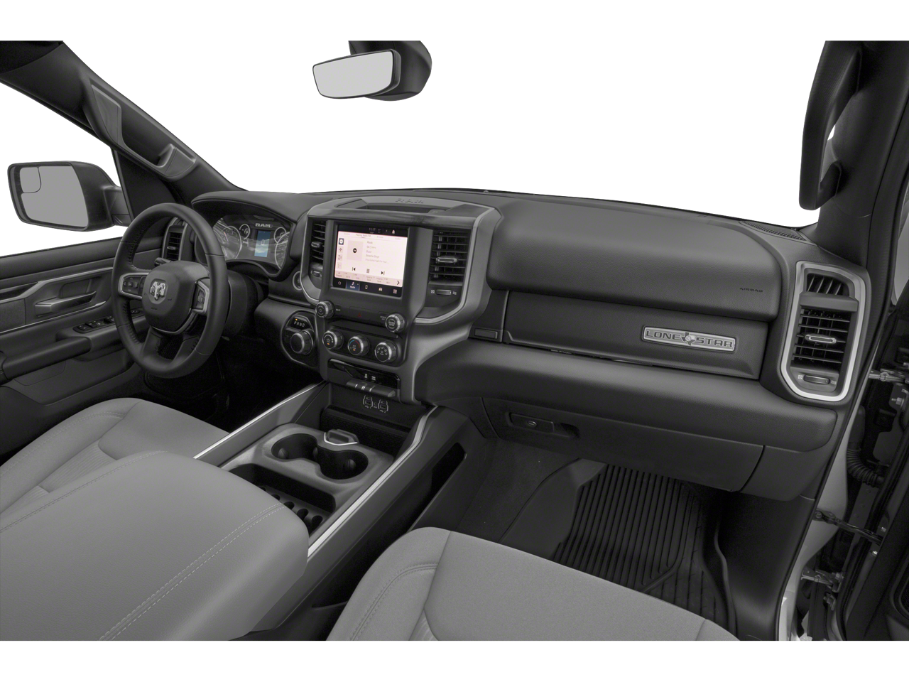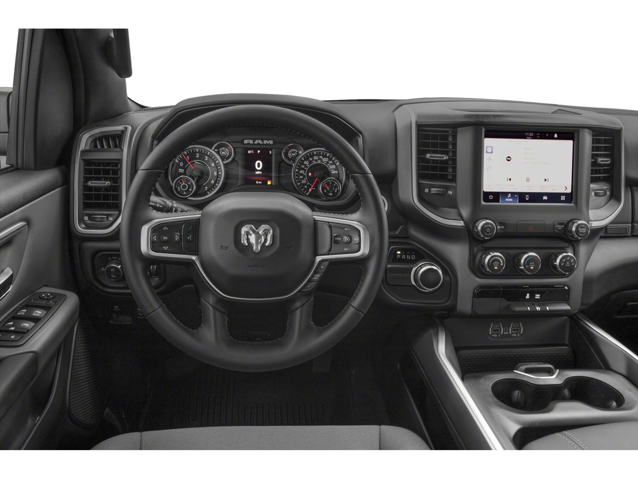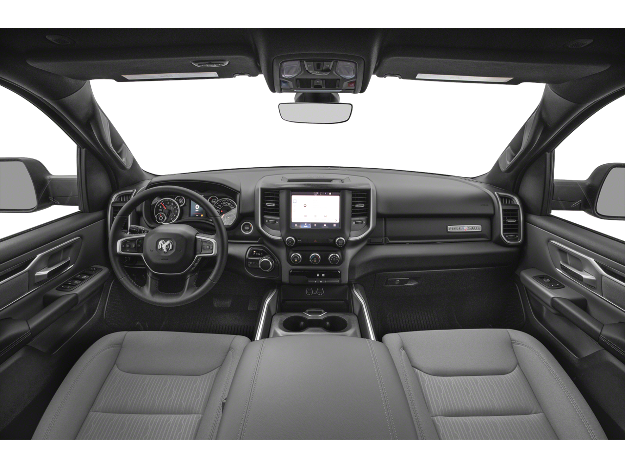 Below is all the standard equipment Bed Utility Group (MOPAR 4 Adjustable Cargo Tie-Down Hooks, MOPAR Deployable Bed Step, MOPAR Spray In Bedliner, and Pick-Up Box Lighting), Big Horn Level B Equipment Group (DISC) (115V Auxiliary Power Outlet, 115V Auxiliary Rear Power Outlet, 400W Inverter, 4G LTE Wi-Fi Hot Spot, 8.4 Touchscreen Display, Air Conditioning ATC w/Dual Zone Control, Apple CarPlay, Auto-Dimming Exterior Driver Mirror, Auto-Dimming Rear-View Mirror, Black Premium Power Mirrors (GUL), Bluetooth® Handsfree Phone & Audio, Class IV Receiver Hitch, Cluster 7.0 TFT Color Display, Connectivity - US/Canada, Exterior Mirrors Courtesy Lamps, Exterior Mirrors w/Supplemental Signals, Foam Bottle Insert (Door Trim Panel), For More Info, Call 800-643-2112, Glove Box Lamp, Google Android Auto, Heated Front Seats, Heated Steering Wheel, Integrated Center Stack Radio, Media Hub w/2 Charge Only USBs, ParkSense Front/Rear Park Assist w/Stop, Power 2-Way Driver Lumbar Adjust, Power 8-Way Driver Seat, Power Adjustable Pedals, Radio: Uconnect 5 W w/8.4 Display, Rear Dome w/On/Off Switch Lamp, Rear Power Sliding Window, Rear Window Defroster, Remote Start System, Security Alarm, SiriusXM Radio Service, SiriusXM Satellite Radio, Sun Visors w/Illuminated Vanity Mirrors, Universal Garage Door Opener, and USB Host Flip), Night Edition (3 Rear Seat Head Restraints, 4 Way Front Headrests, Accent Color Premium Power Mirrors, Anti-Spin Differential Rear Axle, Black Exterior Truck Badging, Black Headlamp Bezels, Black Interior Accents, Black Painted Exterior Mirrors Caps, Body Color Front Bumper, Body Color Rear Bumper w/Step Pads, Bucket Seats, Delete LED Lamp - Floor Console Bin, Deluxe Cloth Bucket Seats, Dual Exhaust w/Black Tips, Front Seat Back Map Pockets, Full Length Floor Console, Grille Surround 1 Black Texture 2 Black, Manual Adjust 4-Way Front Passenger Seat, Rear 60/40 Folding Seat, and Wheels: 20 x 9.0 Premium Paint/Polished), Quick Order Package 23Z Big Horn (Big Horn Badge), 4-Wheel Disc Brakes, 48V Belt Starter Generator, 6 Speakers, ABS brakes, Air Conditioning, Alloy wheels, AM/FM radio, Black Exterior Mirrors, Brake assist, Bumpers: chrome, Cloth Bench Seat, Compass, Convex Wide-Angle Mirror Insert, Delay-off headlights, Driver door bin, Dual front impact airbags, Dual front side impact airbags, Electronic Stability Control, Emergency communication system: SiriusXM Guardian, Front anti-roll bar, Front Center Armrest w/Storage, Front fog lights, Front License Plate Bracket, Front reading lights, Front wheel independent suspension, Fully automatic headlights, Global Telematics Box Module (TBM), GPS Antenna Input, Heated door mirrors, Illuminated entry, Integrated Voice Command w/Bluetooth®, Leather steering wheel, Low tire pressure warning, Occupant sensing airbag, Outside temperature display, Overhead airbag, Overhead console, Panic alarm, ParkView Rear Back-Up Camera,
