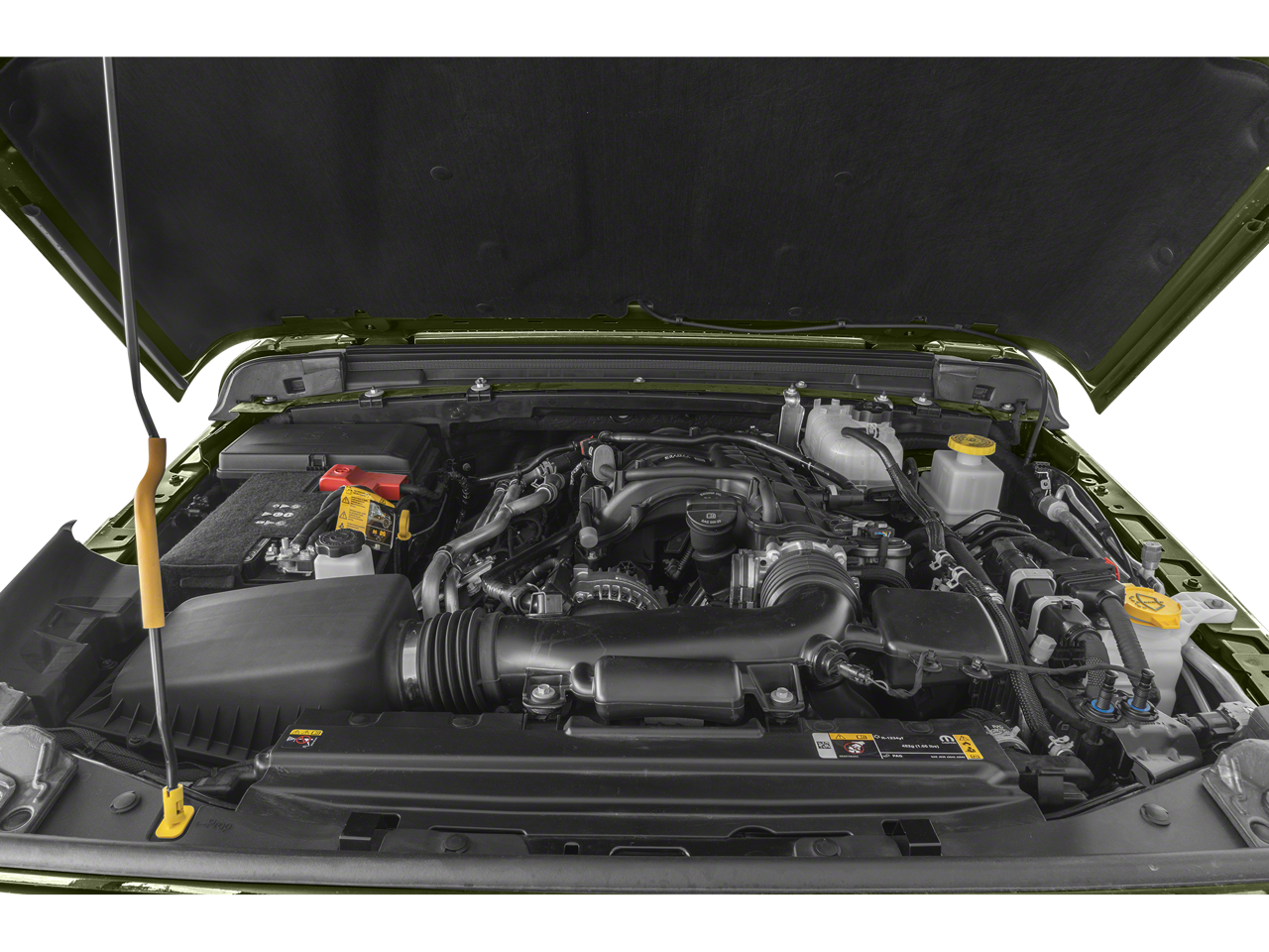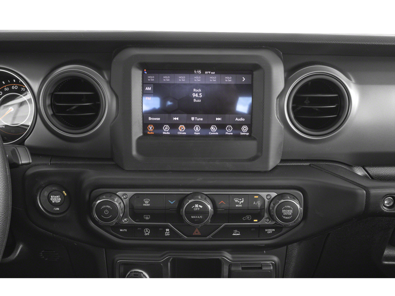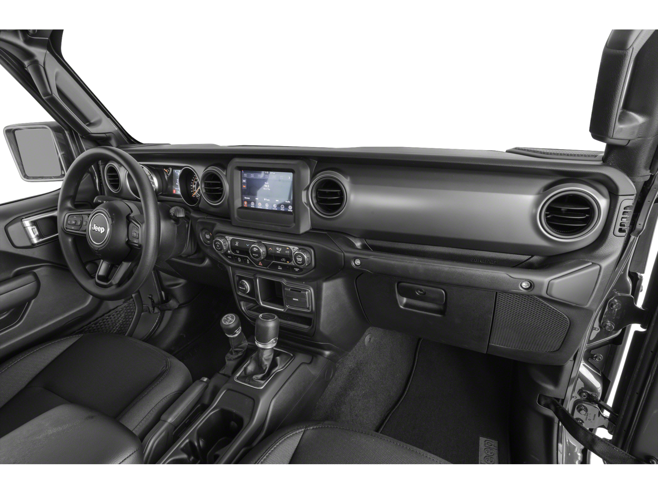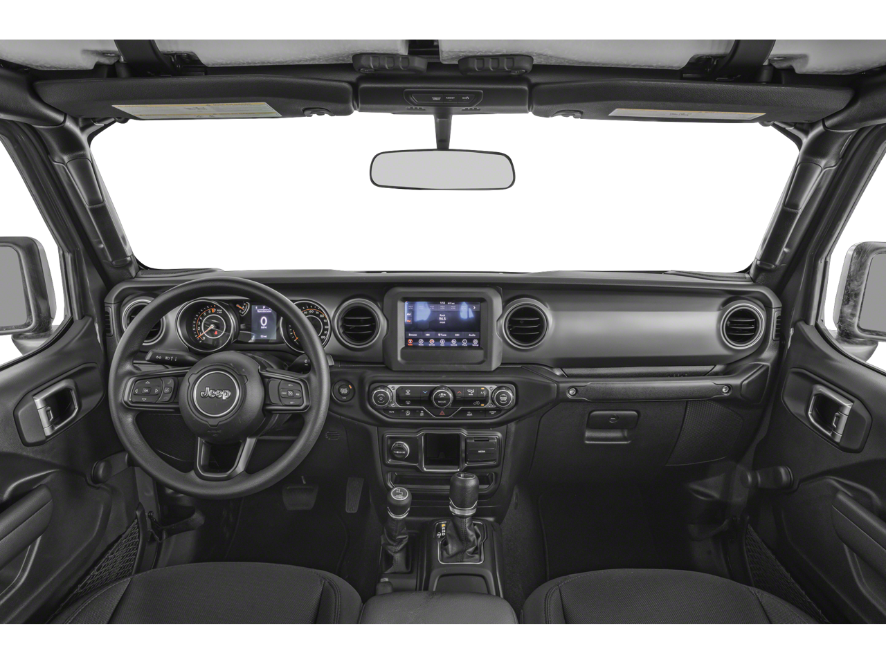 Below is all the standard equipment 8.4 Radio & Premium Audio Group (400W Inverter, 4G LTE Wi-Fi Hot Spot, Alpine Premium Audio System, Apple CarPlay, Google Android Auto, GPS Antenna Input, Integrated Center Stack Radio, Integrated Voice Command w/Bluetooth®, Radio: Uconnect 4C Nav w/8.4 Display, and USB Host Flip), Cold Weather Group, Convenience Group, Max Tow Package w/4.10 Axle Ratio (Anti-Spin Differential Rear Axle and Trailer Hitch Zoom), Popular Equipment Package (Black 3-Piece Hard Top), Quick Order Package 23S Sport S (Sun Visors w/Illuminated Vanity Mirrors), Quick Order Package 24S Sport S, Trailer Tow Package, 4-Wheel Disc Brakes, 8 Speakers, ABS brakes, Air Conditioning, AM/FM radio, Apple CarPlay/Android Auto, Brake assist, Cloth Low-Back Bucket Seats, Compass, Delay-off headlights, Driver door bin, Driver vanity mirror, Dual front impact airbags, Dual front side impact airbags, Electronic Stability Control, Emergency communication system, Front anti-roll bar, Front Bucket Seats, Front Center Armrest w/Storage, Front fog lights, Front reading lights, Integrated roll-over protection, Low tire pressure warning, Normal Duty Suspension, Occupant sensing airbag, Outside temperature display, ParkView Rear Back-Up Camera, Passenger door bin, Passenger vanity mirror, Power steering, Radio data system, Radio: Uconnect 4 w/7 Display, Rear anti-roll bar, Rear reading lights, Speed control, Split folding rear seat, Steering wheel mounted audio controls, Tachometer, Telescoping steering wheel, Tilt steering wheel, Traction control, Trip computer, Variably intermittent wipers, Wheels: 17 x 7.5 Black Steel Styled, and Wheels: 17 x 7.5 Tech Silver Aluminum (DISC)