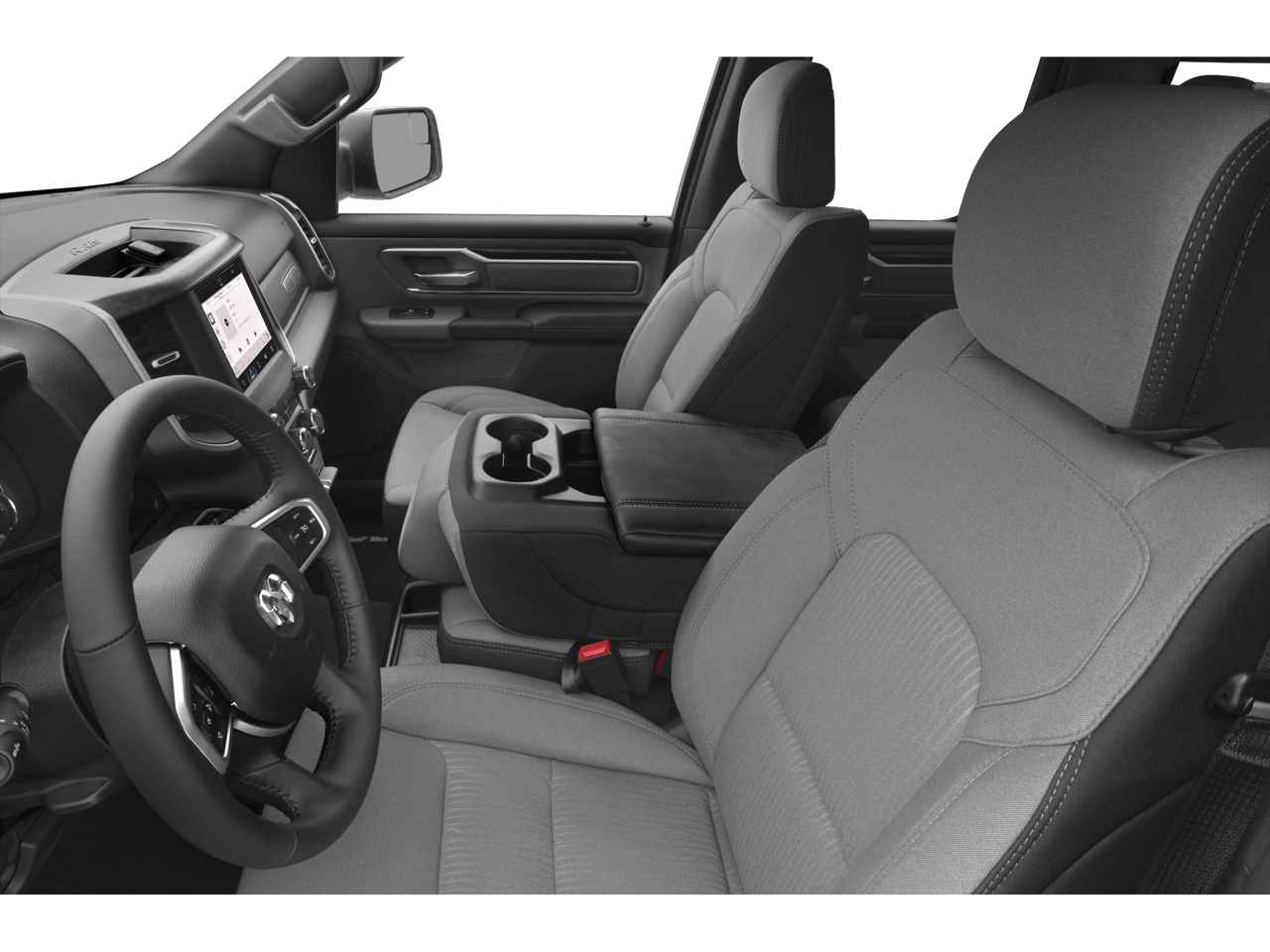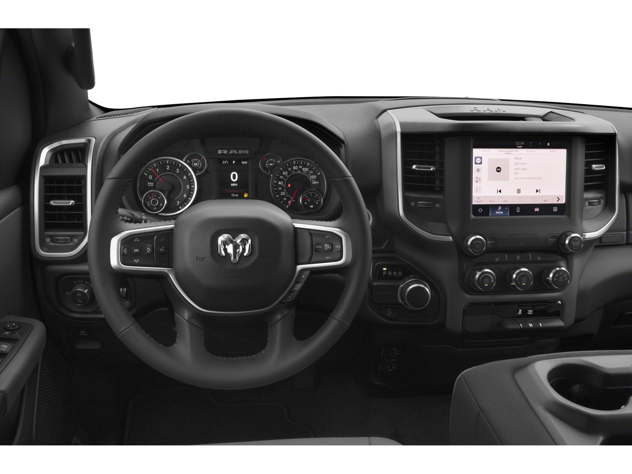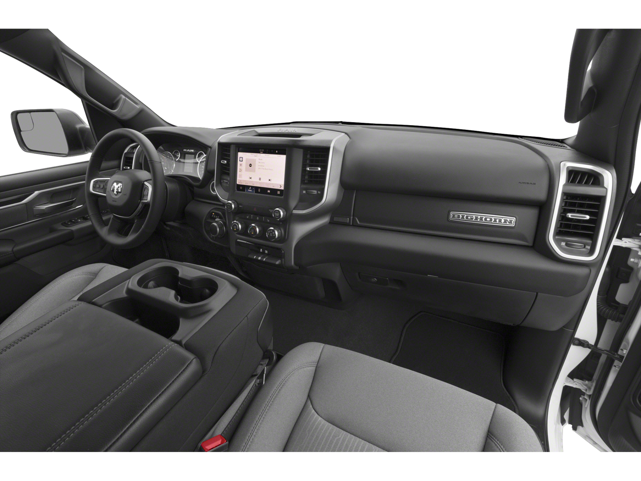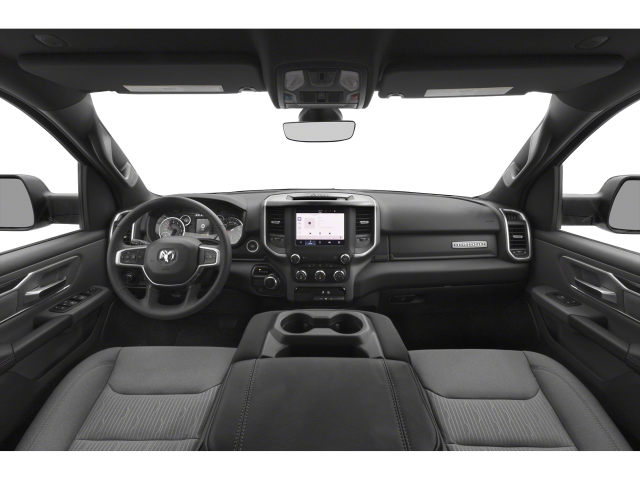Below is all the standard equipment Big Horn Level 1 Equipment Group (4G LTE Wi-Fi Hot Spot, 8.4 Touchscreen Display, Apple CarPlay, Auto-Dimming Exterior Driver Mirror, Auto-Dimming Rear-View Mirror, Black Exterior Mirrors, Black Premium Power Mirrors, Bluetooth® Handsfree Phone & Audio, Class IV Receiver Hitch, Connectivity - US/Canada, Electric Shift-On-Demand Transfer Case, Exterior Mirrors Courtesy Lamps, Exterior Mirrors w/Heating Element, Exterior Mirrors w/Supplemental Signals, For Details, Visit DriveUconnect.com, For More Info, Call 800-643-2112, Front Fog Lamps, Glove Box Lamp, Google Android Auto, GPS Antenna Input, Heated Front Seats, Heated Steering Wheel, Integrated Center Stack Radio, Passenger Sun Visor w/Illuminated Mirror, Power-Folding Mirrors, Radio: Uconnect 5 W w/8.4 Display, Rear Dome w/On/Off Switch Lamp, Rear Power Sliding Window, Rear Window Defroster, SiriusXM Satellite Radio, and USB Host Flip), Quick Order Package 23Z Big Horn (Big Horn Badge), 3 Rear Seat Head Restraints, 4 Way Front Headrests, 4-Wheel Disc Brakes, 48V Belt Starter Generator, 6 Speakers, ABS brakes, Air Conditioning, Alloy wheels, AM/FM radio, Brake assist, Bumpers: chrome, Cloth Bench Seat, Compass, Convex Wide-Angle Mirror Insert, Delay-off headlights, Driver door bin, Dual front impact airbags, Dual front side impact airbags, Electronic Stability Control, Emergency communication system: SiriusXM Guardian, Front anti-roll bar, Front Center Armrest w/Storage, Front License Plate Bracket, Front reading lights, Front Seat Back Map Pockets, Front wheel independent suspension, Fully automatic headlights, Heated door mirrors, Illuminated entry, Integrated Voice Command w/Bluetooth®, Leather steering wheel, Low tire pressure warning, Manual Adjust 4-Way Front Passenger Seat, Occupant sensing airbag, Outside temperature display, Overhead airbag, Overhead console, Panic alarm, ParkView Rear Back-Up Camera, Passenger door bin, Passenger vanity mirror, Power door mirrors, Power steering, Power windows, Radio data system, Radio: Uconnect 3 w/5 Display, Rear 60/40 Folding Seat, Rear anti-roll bar, Rear seat center armrest, Rear step bumper, Rear Wheelhouse Liners, Remote keyless entry, Speed control, Split folding rear seat, Steering wheel mounted audio controls, Tachometer, Telescoping steering wheel, Tilt steering wheel, Traction control, Trip computer, Variably intermittent wipers, Voltmeter, and Wheels: 18 x 8 Cast-Aluminum PainteD.