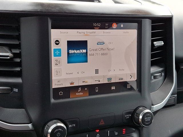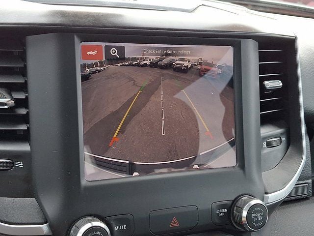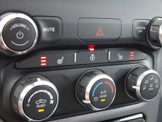 Below is all the standard equipment Bed Utility Group (MOPAR 4 Adjustable Cargo Tie-Down Hooks, MOPAR Deployable Bed Step, MOPAR Spray In Bedliner, and Pick-Up Box Lighting), Big Horn Level 1 Equipment Group (2nd Row In Floor Storage Bins, 4G LTE Wi-Fi Hot Spot, 8.4 Touchscreen Display, Apple CarPlay, Auto-Dimming Exterior Driver Mirror, Auto-Dimming Rear-View Mirror, Black Exterior Mirrors, Black Premium Power Mirrors, Bluetooth® Handsfree Phone & Audio, Class IV Receiver Hitch, Connectivity - US/Canada, Convex Wide-Angle Exterior Mirror Insert, Electric Shift-On-Demand Transfer Case, Exterior Mirrors Courtesy Lamps, Exterior Mirrors w/Heating Element, Exterior Mirrors w/Supplemental Signals, For Details, Visit DriveUconnect.com, For More Info, Call 800-643-2112, Front Fog Lamps, Glove Box Lamp, Google Android Auto, GPS Antenna Input, Heated Front Seats, Heated Steering Wheel, Integrated Center Stack Radio, Passenger Sun Visor w/Illuminated Mirror, Power-Folding Mirrors, Radio: Uconnect 5 W w/8.4 Display, Rear Dome w/On/Off Switch Lamp, Rear Power Sliding Window, Rear Window Defroster, SiriusXM Satellite Radio, and USB Host Flip), Quick Order Package 27Z Big Horn (Big Horn Badge), Certified Pre-Owned Certified, 3 Rear Seat Head Restraints, 3.21 Rear Axle Ratio, 4 Way Front Headrests, 4-Wheel Disc Brakes, 48V Belt Starter Generator, 6 Speakers, ABS brakes, Active Noise Control System, Air Conditioning, Alloy wheels, AM/FM radio, Brake assist, Bumpers: chrome, Cloth Bench Seat, Compass, Delay-off headlights, Driver door bin, Dual front impact airbags, Dual front side impact airbags, Dual Rear Exhaust w/Bright Tips, Electronic Stability Control, Emergency communication system: SiriusXM Guardian, Front anti-roll bar, Front Center Armrest w/Storage, Front License Plate Bracket, Front reading lights, Front Seat Back Map Pockets, Front wheel independent suspension, Fully automatic headlights, Global Telematics Box Module (TBM), Heated door mirrors, Heavy-Duty Engine Cooling, HEMI Badge, Illuminated entry, Integrated Voice Command w/Bluetooth®, Leather steering wheel, Low tire pressure warning, MOPAR Front & Rear Rubber Floor Mats, Occupant sensing airbag, Outside temperature display, Overhead airbag, Overhead console, Panic alarm, ParkView Rear Back-Up Camera, Passenger door bin, Passenger vanity mirror, Power door mirrors, Power steering, Power windows, Radio data system, Radio: Uconnect 3 w/5 Display, RAM Grille Badge - Chrome, Rear 60/40 Folding Seat, Rear anti-roll bar, Rear seat center armrest, Rear step bumper, Rear Wheelhouse Liners, Remote keyless entry, Speed control, Split folding rear seat, Steering wheel mounted audio controls, Tachometer, Telescoping steering wheel, Tilt steering wheel, Traction control, Trailer Brake Control, Trip computer, Variably