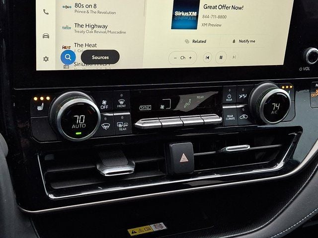 Below is all the standard equipment 3.329 Axle Ratio, 3rd row seats: split-bench, 4-Wheel Disc Brakes, 6 Speakers, ABS brakes, Air Conditioning, Alloy wheels, AM/FM radio: SiriusXM, Apple CarPlay/Android Auto, Auto High-beam Headlights, Auto-dimming Rear-View mirror, Automatic temperature control, Brake assist, Bumpers: body-color, Delay-off headlights, Driver door bin, Driver vanity mirror, Dual front impact airbags, Dual front side impact airbags, Electronic Stability Control, Emergency communication system: Safety Connect (up to 10-year trial subscription), Exterior Parking Camera Rear, Four wheel independent suspension, Front anti-roll bar, Front Bucket Seats, Front Center Armrest, Front dual zone A/C, Front fog lights, Front reading lights, Fully automatic headlights, Garage door transmitter: HomeLink, Heated door mirrors, Heated Front Bucket Seats, Heated front seats, Illuminated entry, Knee airbag, Leather Shift Knob, Leather steering wheel, Low tire pressure warning, Occupant sensing airbag, Outside temperature display, Overhead airbag, Overhead console, Panic alarm, Passenger door bin, Passenger vanity mirror, Power door mirrors, Power driver seat, Power Liftgate, Power moonroof, Power passenger seat, Power steering, Power windows, Radio: 12.3 Toyota Audio Multimedia w/6 Speakers, Radio: 8 Toyota Audio Multimedia, Rear air conditioning, Rear anti-roll bar, Rear reading lights, Rear window defroster, Rear window wiper, Reclining 3rd row seat, Remote keyless entry, Roof rack: rails only, Security system, SofTex Seat Trim, Speed control, Speed-sensing steering, Split folding rear seat, Spoiler, Steering wheel mounted audio controls, Tachometer, Telescoping steering wheel, Tilt steering wheel, Traction control, Trip computer, Turn signal indicator mirrors, Variably intermittent wipers, and Wheels: 18 Machined-Finish Alloy.