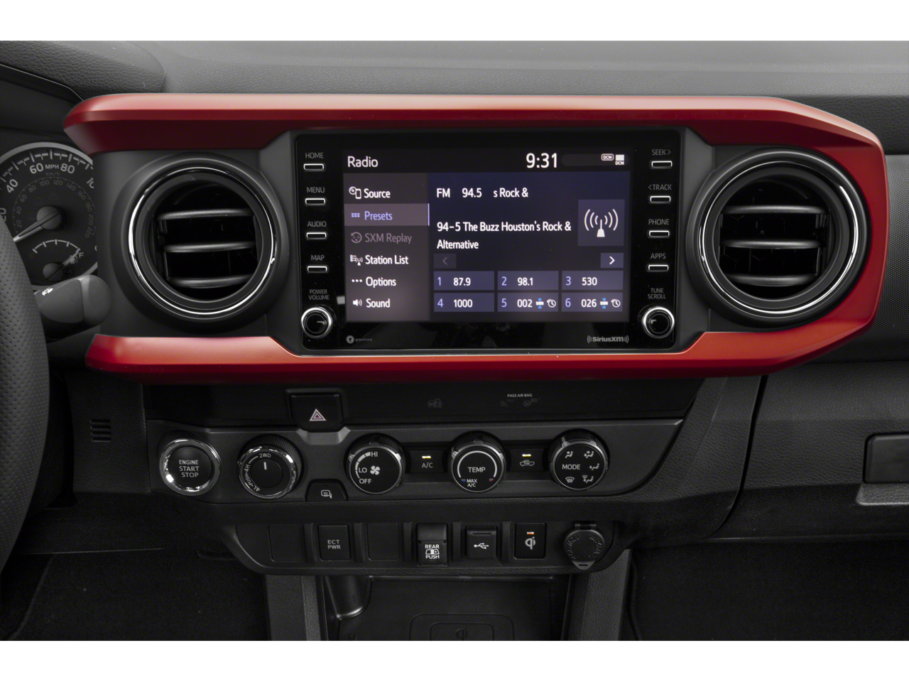 Below is all the standard equipment 4WD, 120V/400W Deck Mounted AC Power, 17 Machined Alloy Wheels, 6 Speakers, ABS brakes, Air Conditioning, Alloy wheels, AM/FM radio: SiriusXM, Anti-whiplash front head restraints, Apple CarPlay/Android Auto, Auto High-beam Headlights, Auto-dimming Rear-View mirror, Auto-Dimming Rearview Mirror w/HomeLink, Automatic temperature control, Axle Ratio: 3.91, Blind Spot Monitor w/Rear Cross Traffic Alert, Brake assist, Bumpers: body-color, Color-Keyed Overfenders, Driver door bin, Dual front impact airbags, Dual front side impact airbags, Electronic Stability Control, Emergency communication system: Safety Connect (1-year trial), Engine Immobilizer, Exterior Parking Camera Rear, Fabric Seat Trim, Front anti-roll bar, Front Bucket Seats, Front Center Armrest, Front Door Smart Key System w/Push Button Start, Front dual zone A/C, Front fog lights, Front reading lights, Front Seats, Front wheel independent suspension, Garage door transmitter: HomeLink, Heated door mirrors, Illuminated entry, Knee airbag, Leather Seat Trim, Leather Shift Knob, Low tire pressure warning, Occupant sensing airbag, Outside temperature display, Overhead airbag, Overhead console, Panic alarm, Passenger door bin, Power door mirrors, Power driver seat, Power Sliding Rear Window w/Privacy Glass, Power steering, Power windows, Radio: Audio, Radio: Premium Audio w/Dynamic Navigation, Radio: Premium JBL Audio w/Dynamic Navigation, Rear Parking Assist Sonar, Rear step bumper, Remote keyless entry, Security system, Speed control, Speed-sensing steering, Split folding rear seat, Steering wheel mounted audio controls, Tachometer, Telescoping steering wheel, Tilt steering wheel, Traction control, Trip computer, Turn signal indicator mirrors, and Variably intermittent wipers.