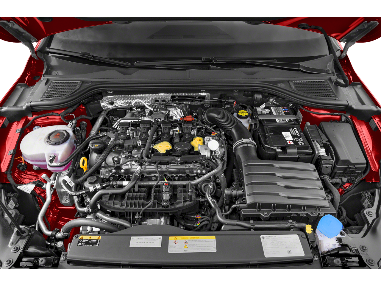 Below is all the standard equipment 4-Wheel Disc Brakes, 7 Speakers, ABS brakes, Air Conditioning, Alloy wheels, AM/FM radio, Auto-dimming Rear-View mirror, Automatic temperature control, Brake assist, Bumpers: body-color, Cloth Seating Surfaces, Compass, Delay-off headlights, Driver door bin, Driver vanity mirror, Dual front impact airbags, Dual front side impact airbags, Electronic Stability Control, Emergency communication system: VW Car-Net Safe & Secure 5-year, Exterior Parking Camera Rear, Forward collision: FCW w/Autonomous Emergency Braking mitigation, Four wheel independent suspension, Front anti-roll bar, Front Bucket Seats, Front Center Armrest, Front fog lights, Front reading lights, Fully automatic headlights, Heated door mirrors, Heated front seats, Heated Front Top Sport Seats, Heated steering wheel, Illuminated entry, Lane Departure Warning System, Leather steering wheel, Low tire pressure warning, Occupant sensing airbag, Outside temperature display, Overhead airbag, Overhead console, Panic alarm, Passenger door bin, Passenger vanity mirror, Power door mirrors, Power driver seat, Power passenger seat, Power steering, Power windows, Radio data system, Radio: MIB3 Composition Color w/8.25 Touchscreen, Rain sensing wipers, Rear anti-roll bar, Rear reading lights, Rear seat center armrest, Rear window defroster, Rear window wiper, Remote keyless entry, Security system, Speed control, Speed-sensing steering, Speed-Sensitive Wipers, Split folding rear seat, Spoiler, Sport steering wheel, Steering wheel mounted audio controls, Tachometer, Telescoping steering wheel, Tilt steering wheel, Traction control, Trip computer, Turn signal indicator mirrors, Variably intermittent wipers, and Wheels: 18 2-Tone Machined Alloy.