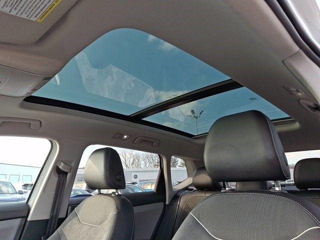 Below is all the standard equipment Black Wheel Package (Wheels: 18 Black Painted Alloy), Panoramic Sunroof Package, Volkswagen Certified Pre-Owned Certified, 4-Wheel Disc Brakes, 5.20 Axle Ratio, 6 Speakers, ABS brakes, Active Blind Spot Monitor, Air Conditioning, Alloy wheels, AM/FM radio: SiriusXM with 360L, Auto High-beam Headlights, Brake assist, Bumpers: body-color, CloudTex & Cloth Seating Surfaces, Compass, Delay-off headlights, Driver door bin, Driver vanity mirror, Dual front impact airbags, Dual front side impact airbags, Electronic Stability Control, Emergency communication system: VW Car-Net Safe & Secure 5-year, Exterior Parking Camera Rear, Four wheel independent suspension, Front anti-roll bar, Front Bucket Seats, Front Center Armrest, Front reading lights, Front Strut Rear Multi-Link Suspension, Fully automatic headlights, Heated door mirrors, Heated Front Comfort Seats, Heated front seats, Heated steering wheel, Illuminated entry, Leather Shift Knob, Low tire pressure warning, Occupant sensing airbag, Outside temperature display, Overhead airbag, Overhead console, Panic alarm, Passenger door bin, Passenger vanity mirror, Power door mirrors, Power driver seat, Power steering, Power windows, Radio data system, Radio: MIB3 Composition Media AM/FM/HD, Rain sensing wipers, Rear anti-roll bar, Rear seat center armrest, Rear window defroster, Rear window wiper, Remote keyless entry, Security system, Speed control, Speed-sensing steering, Split folding rear seat, Spoiler, Steering wheel mounted audio controls, Tachometer, Telescoping steering wheel, Tilt steering wheel, Traction control, Trip computer, Variably intermittent wipers, and Wheels: 18 2-Tone Machined Alloy.